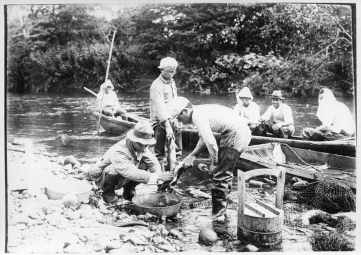留別川にて鱒の採卵作業