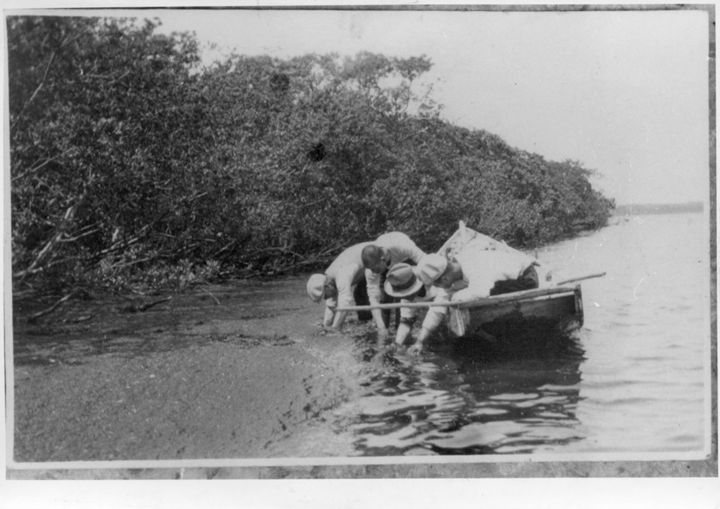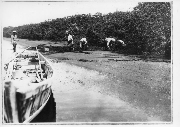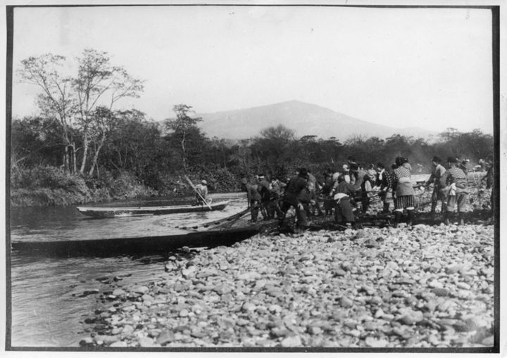 水辺にて漁をする人々