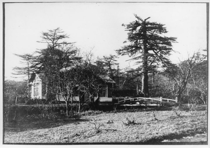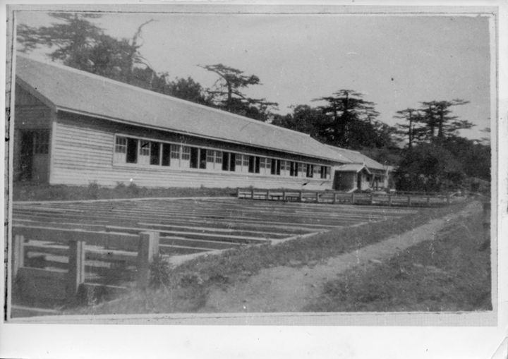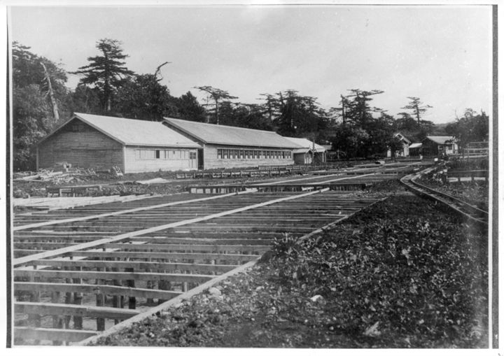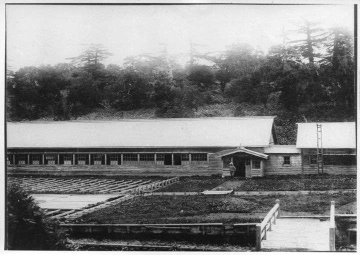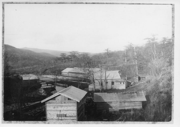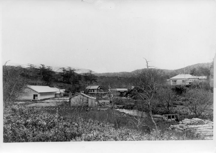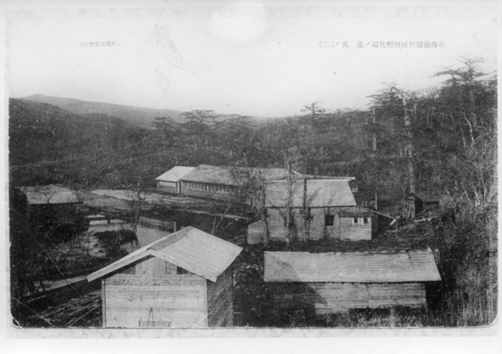 留別鮭鱒孵化場と後ろに広がる色丹松の林