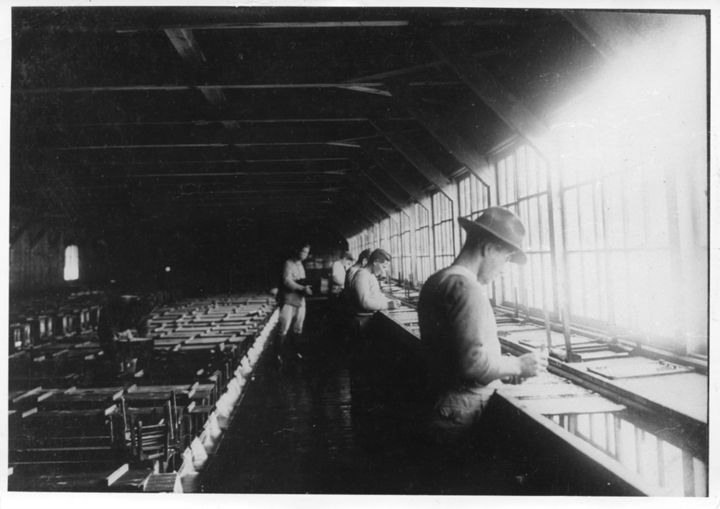 孵化場内作業場での検卵作業風景