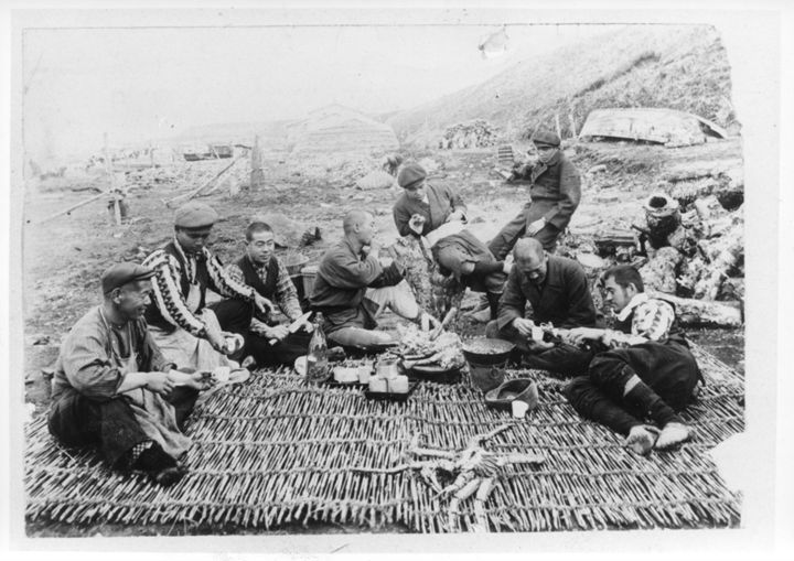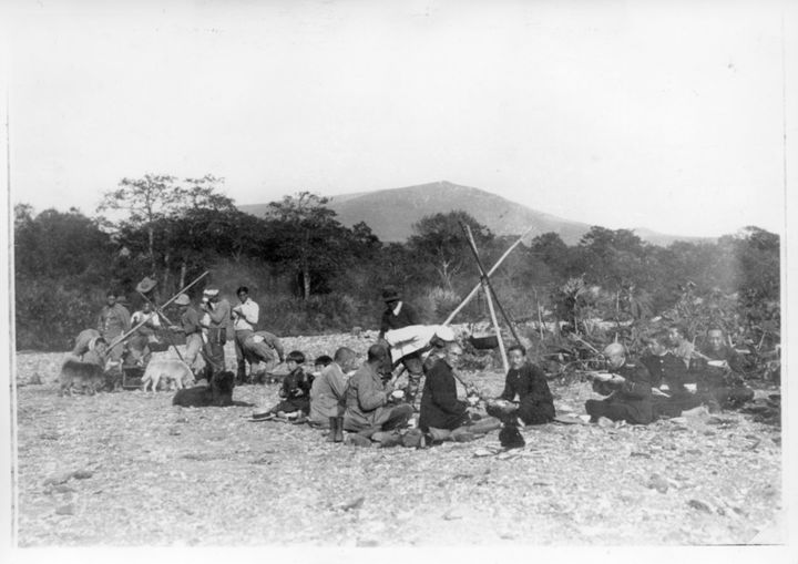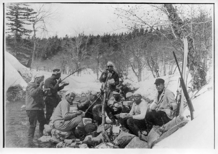 山中にて食事をとる人々